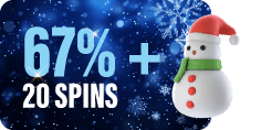 A 67% Slots Deposit Match Bonus, plus 20 Bonus Spins on Snowmania!